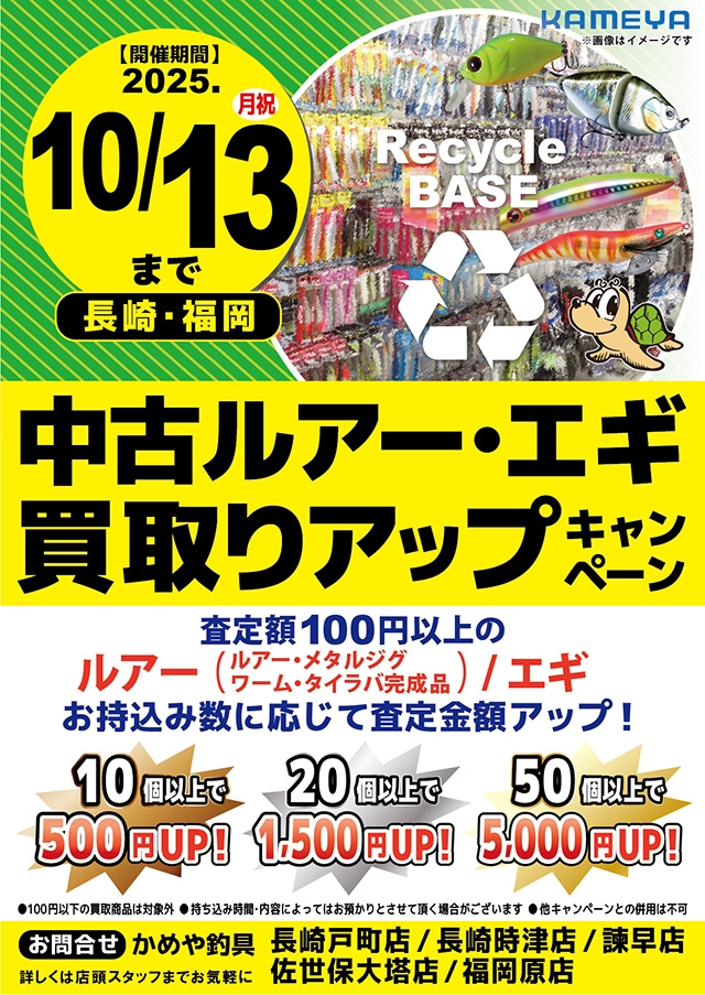 長崎戸町店 瀬戸です(*^^)vまだまだ残暑が厳しい日が続いていますね!中古品ルアー・エギ買取りアップキャンペーンを10月13日(祝)まで開催します。使わなくなったルアー・エギなどまとめて持ち込んで頂くと数に応じて査定金額アップ是非この機会にキャンペーンをご利用して下さいね!皆様のお越しをスタッフ一同心よりお待ちしております。