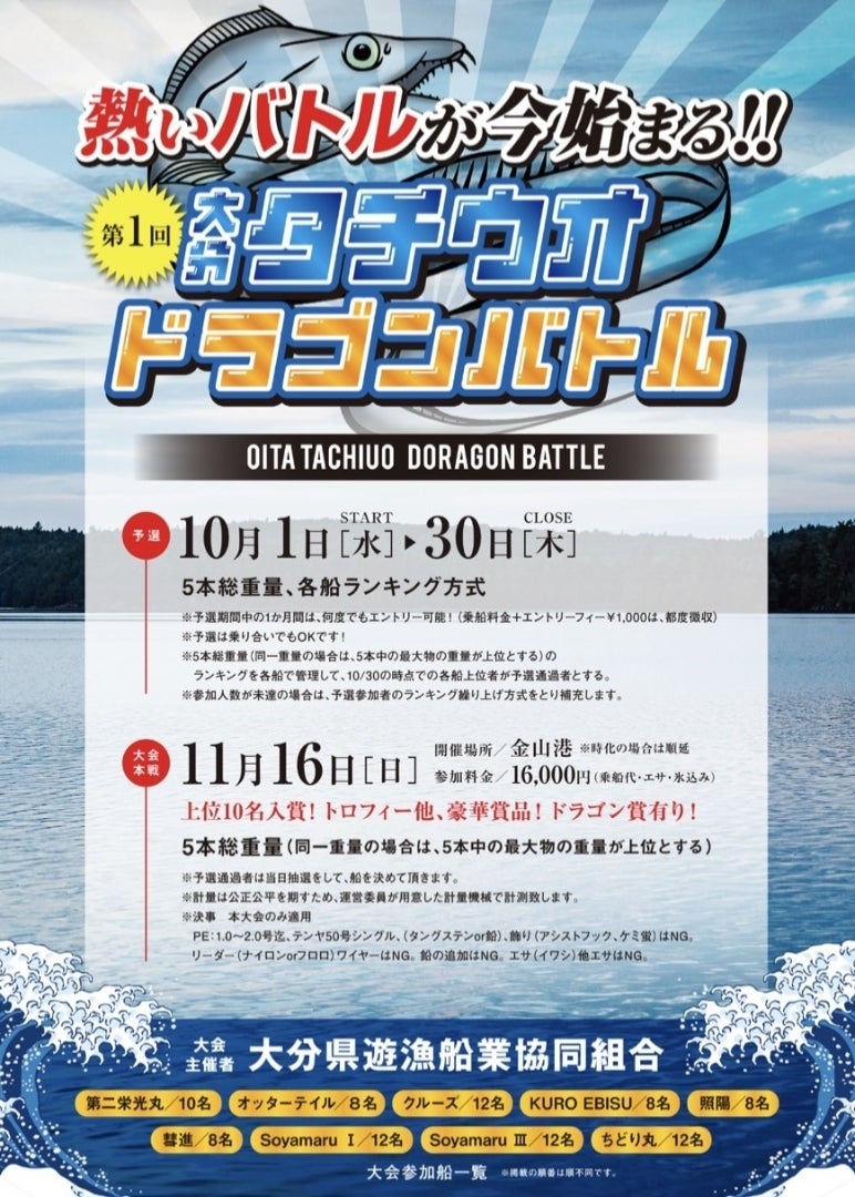 今月より大分県遊漁船業協同組合様が主催の『第一回 大分タチウオドラゴンバトル』が始まっておりますので、せっかくなので参加してきました(`・ω・´)ゞ