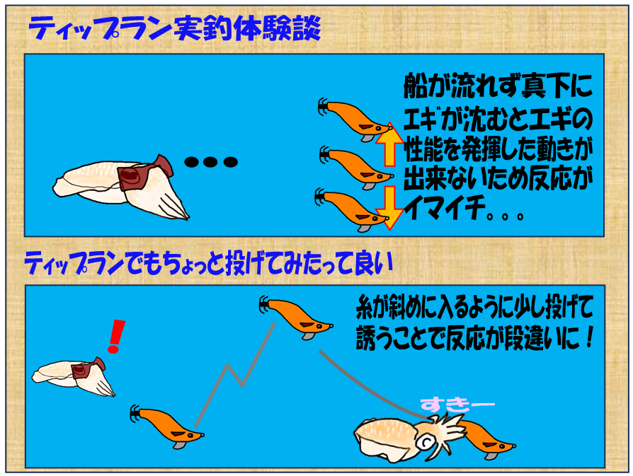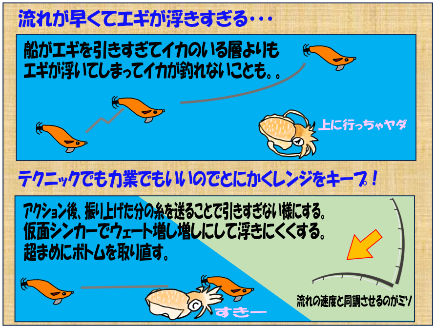 あと、インスタにも図にも書いてないことになりますが、糸を送る事でエギが引っ張られる速度がゆっくりになってイカがエギを掴みやすくなるとも感じました。