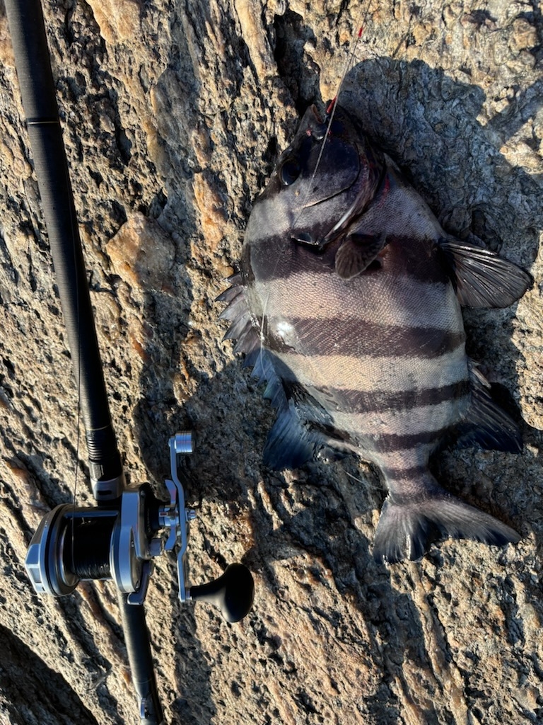 すぐに伸びていき、ゆっくり重さを加えながら合わせを入れると大きくはないですが、キロ半弱の石鯛がきてくれました。