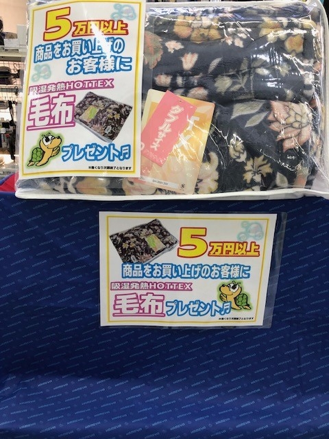 長崎戸町店 瀬戸です(*^^)v朝晩は幾分寒さを感じるようになりましたね!!これから釣りのベストシーズンに入り、磯や船など大変賑わって参ります。秋の新製品も入荷し始めておりますので是非遊びに来て下さいねまた10月25日(土)より5万円以上お買い上げのお客様には毛布をプレゼント致します。(無くなり次第終了)是非この機会の欲しかった商品を手にして下さいね(*’ω’*)スタッフ一同心よりお待ちしております。