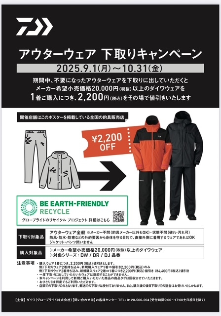 ただいま開催中のダイワ「アウターウェアキャンペーン」も今月末までとなっております!