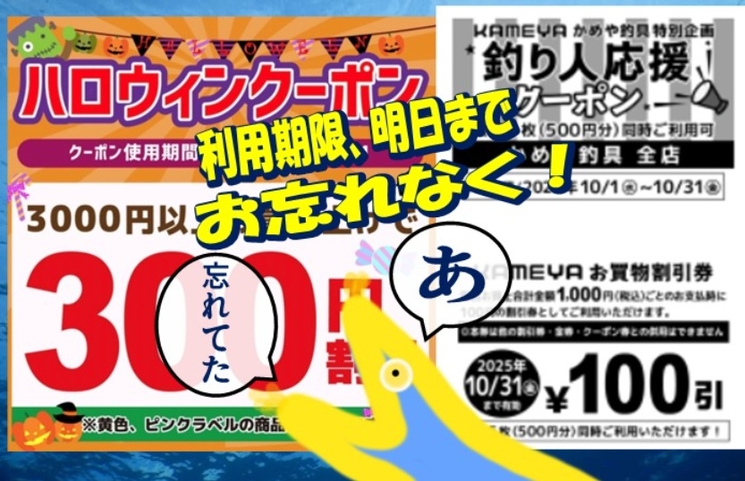 どうも、かめや釣具佐世保大塔店の宮本ですm(__)m早くも10月が残り僅かですね( ;∀;)。歳取ると日にちが経つのが早いを実感しています。さて、お手持ちのクーポンや金券、