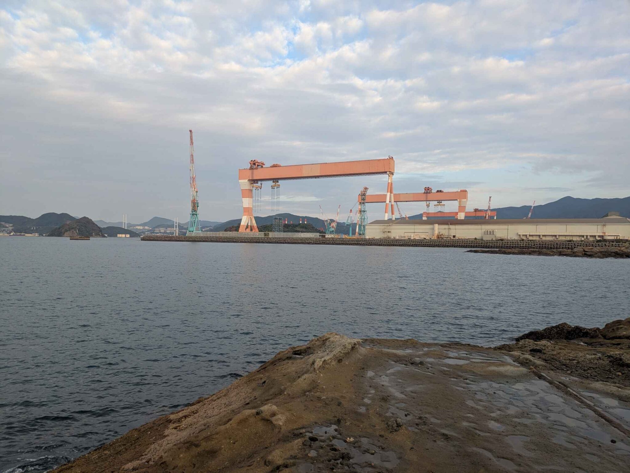 香焼の造船工場、奥が長崎港でうっすら女神大橋がみえます