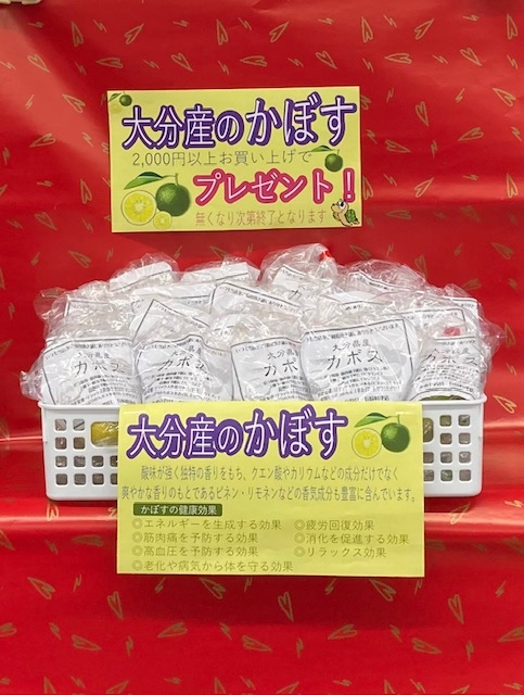 こんにちはかめや釣具長崎時津店さかいです!本日より嬉しい秋のプレゼント♪2000円以上お買い上げのお客様へ大分県産かぼすをお渡ししています。無くなり次第終了となりますので気になる方はお早めにご来店くださいませ!