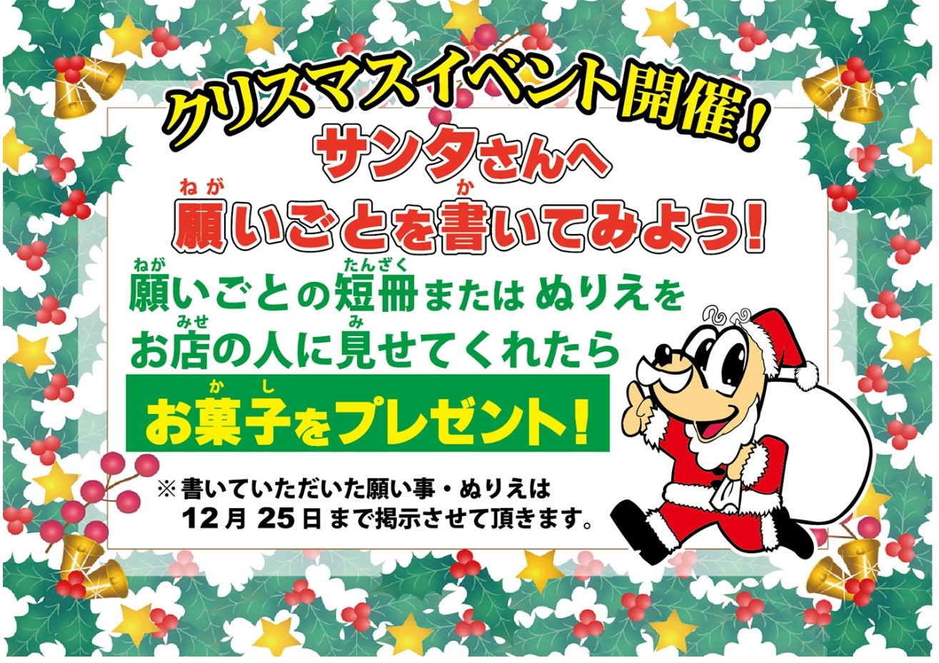当店、ツリーを飾っておりますが、本日よりお願い事の短冊を書いて頂くと「お菓子」のプレゼントをスタートしてますよ。サンタさんに欲しい物とか書いてお願いしてはいかがでしょうか(*^▽^*)。