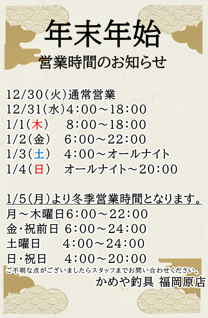 今年もかめや釣具福岡原店をご利用頂き誠に有り難う御座いました。