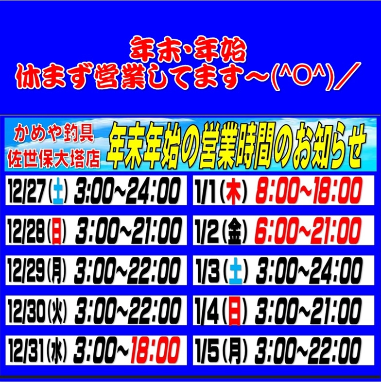 当店、年末年始も休まず営業しますが、営業時間の変更があります。