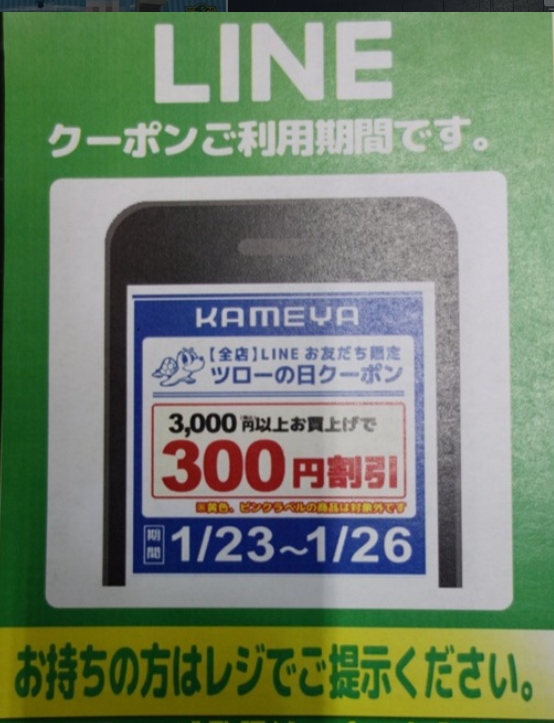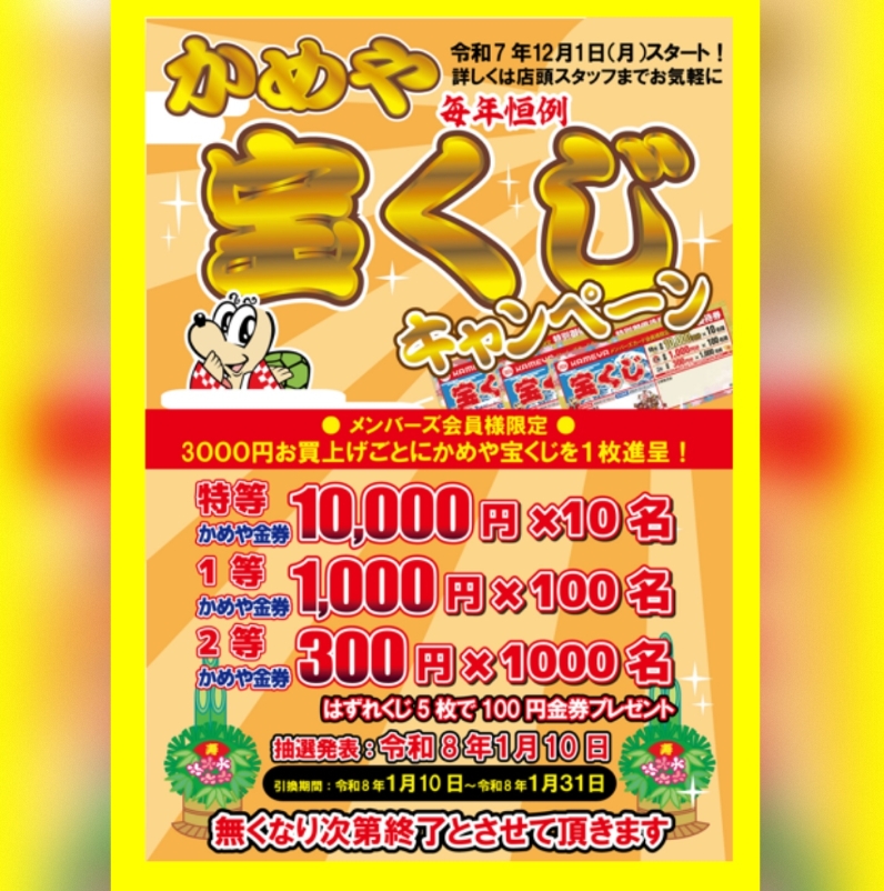 昨年12月から配布していたかめや宝くじの引換期間が1月31日までと迫ってきております。