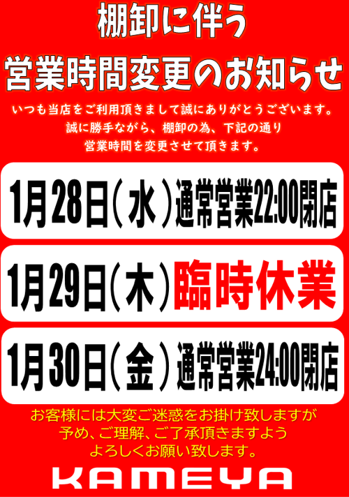 棚卸の為、1月29日(木)が終日、臨時休業となります。