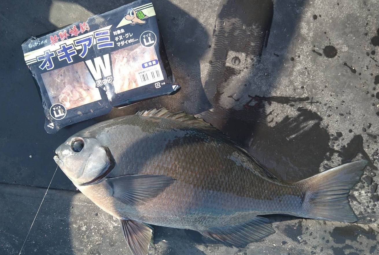 40アップの丸々したのが( *´艸`)、付けエサは「なぶら水産 新鮮爆釣オキアミ」。