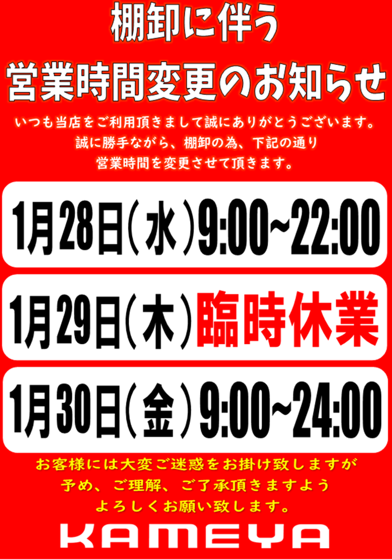 明日1月29日(木)は棚卸の為、臨時休業!!