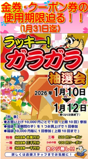 ガラガラ抽選会のクーポン及び金券の使用期限が1/31までとなクーポンとなっております。