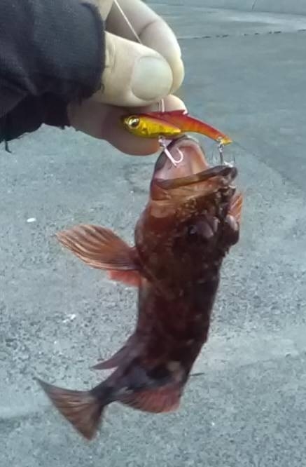 最大で24cm。赤メバル?って感じ、このまま狙えば数は稼げそうなんですが、ブルーバック(青?)の尺を狙いたいんで、取っておいった堤防の角・テトラ際・潮が当たる一等地に移動。ルアーはバイブに戻し沈んでいるテトラの際を通すとゴン!!テトラに突っ込むの絶えて抜こうとしたらポロリ( ;∀;)。