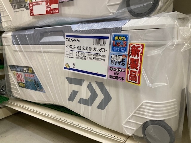 グローブライド【トランクマスターHD3 8000】なんと80Lの超BIGクーラーです!長辺・短辺の内寸は同型60Lと同じ85㎝ですが高さがプラス8cmの31.5㎝にサイズアップ!大きいお魚も尻尾をグネッとすることで納まってくれそうですね氷をしっかり入れれば鮮度維持も◎ぜひチェックしにきてくださいね!ご来店お待ちしてま~す