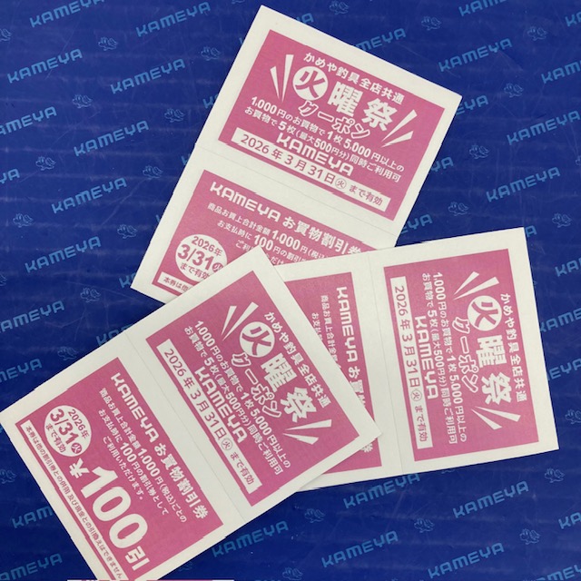 こんばんは、かめや釣具長崎時津店中村です。毎週火曜日にかめや釣具全店共通で使える「火曜祭クーポン」を配布しております。商品ご購入時に1000円毎に100円引きで3月31日まで有効となっておりますので、ご来店時にお使い下さい。