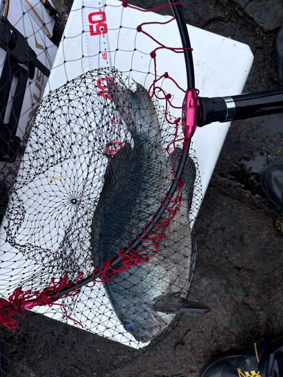 終盤、あまりにも波をかぶり出したので、船着きでやると移動後一投目、竿一本程はいったところでラインメンテしているといきなりバッドから締めこまれ左の瀬にの裏にもう突進。