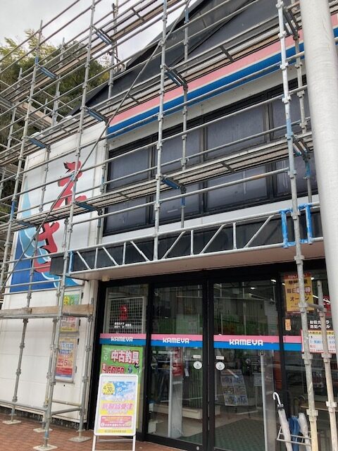 昨日より外灯・天井工事のため店舗外壁に足場を組ませていただいています。営業は通常通り行っておりますので、どうぞお気軽にご入店ください。自販機や喫煙所もご利用いただけますが頭上が低くなっおりますので十分ご注意ください。作業期間は約1ヶ月を予定しています。ご迷惑をおかけしますが何卒ご理解・ご協力の程よろしくお願いいたします。
