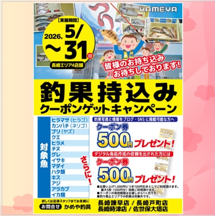 長崎エリアでは釣果持込みクーポンゲットキャンペーンを開催中。