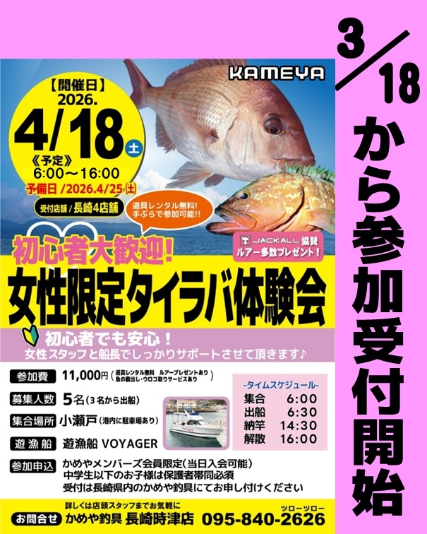 参加申込は3/18より長崎県内のかめや釣具にて承ります