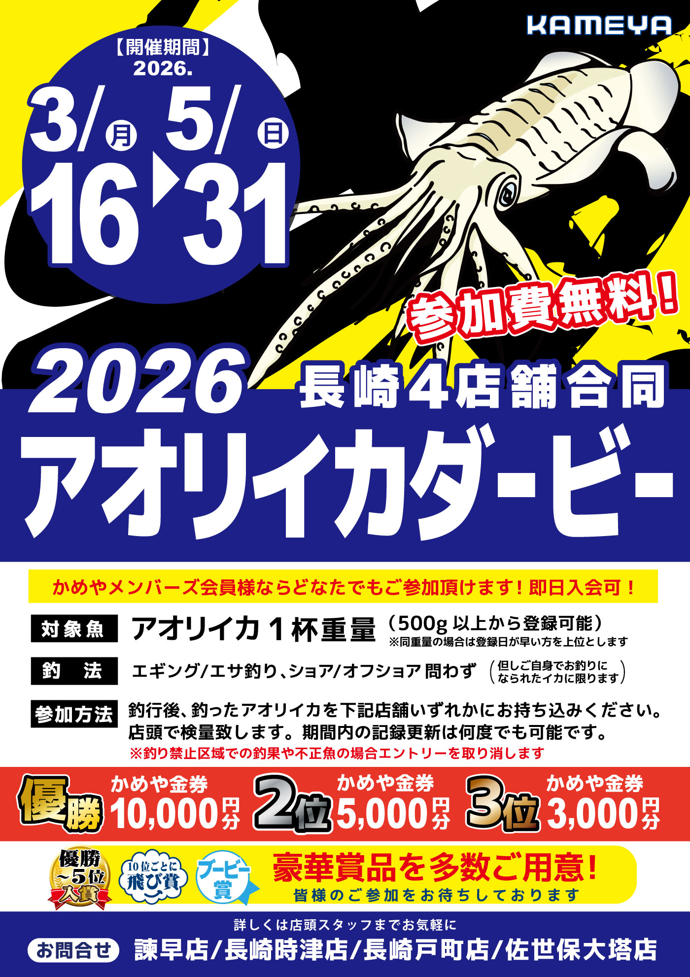 参加費は無料なのでアオリイカが釣れた際はぜひご来店ください。