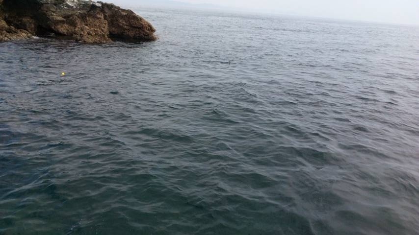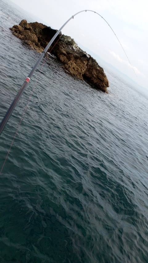 瀬と瀬と水道から潮がでている状況。結構な速さで流れており1投目は100m程流して付けエサが残る状態。ウキは2Bを使用た半遊動で、針迄いれて5m程のタナに。2投目は流れの脇の反転している箇所に行くように流していると、ラインが流れと違う動きで走りヒット!!