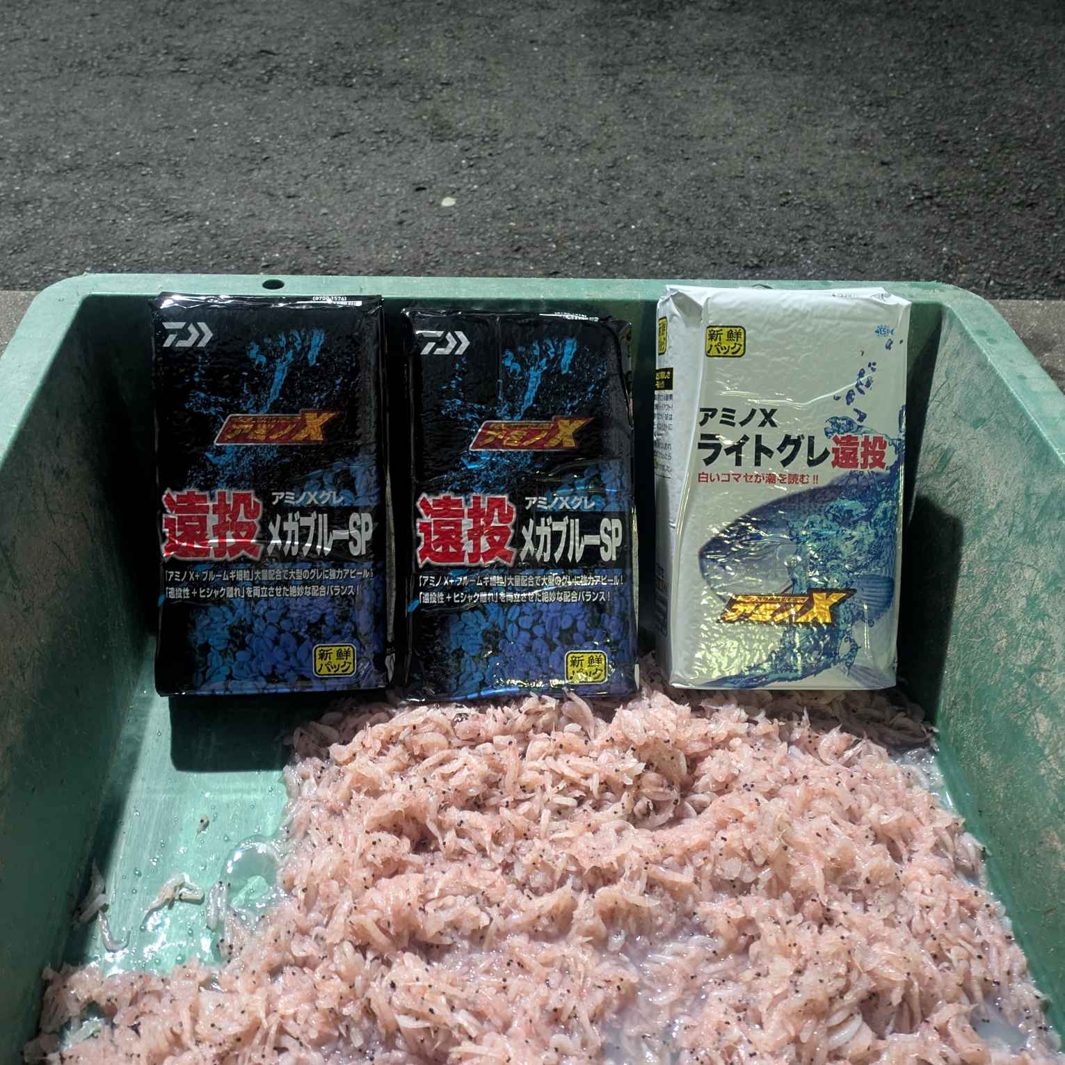 マキエは、オキアミ2角に写真のダイワ集魚剤3袋にパン粉6㎏程