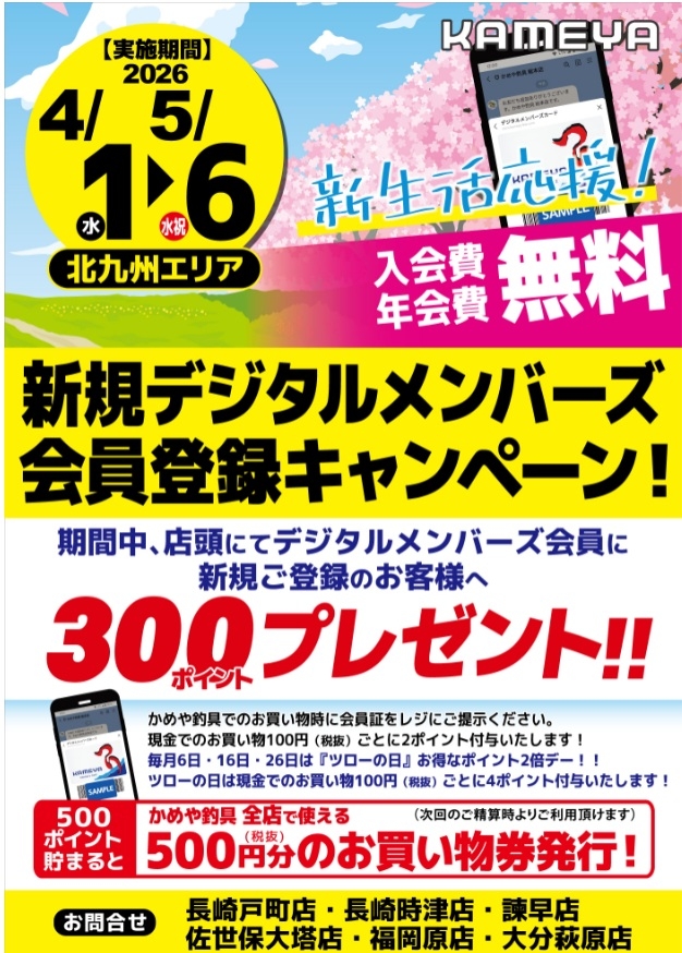 かめや北九州エリア限定でデジタルメンバーズ会員登録して頂くと、その場で300ポイントをプレゼント。500ポイント迄一気に近づきますよ(*´▽`*)。