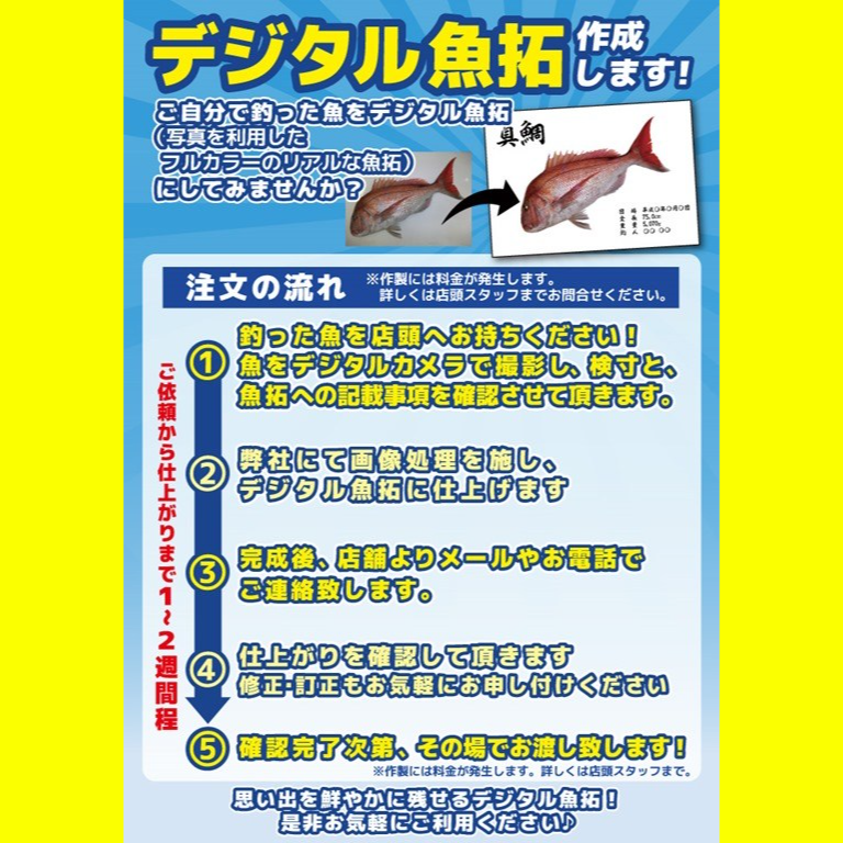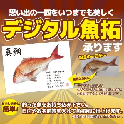 釣られた魚のサイズに合わせてデジタル魚拓作成を承っております。