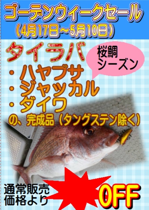今がシーズン真っ盛りの桜鯛(春の乗っ込み真鯛、団体さんでくるんで型・数期待できますよ)。お手軽釣行できるタイラバをお求め易い価格で。