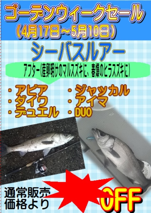 春のアフターシーバス(マルスズキ)、同じく産卵から回復してくるヒラスズキ狙いにシーバスルアーがお求めやすくなってますよ。
