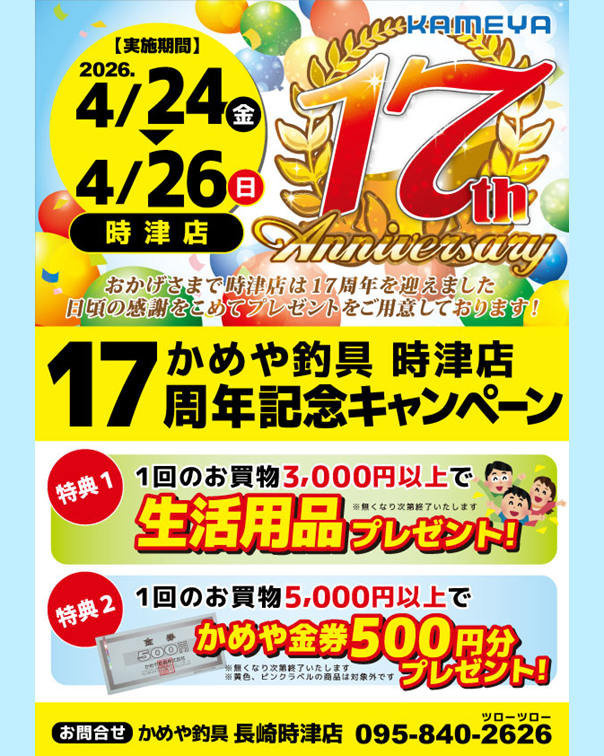 こんにちはかめや釣具長崎時津店さかいです今週末は時津店がアツイ!