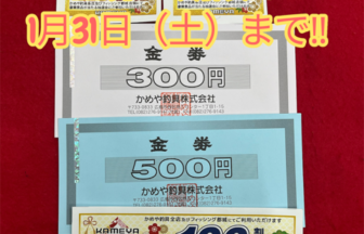 こんばんは、かめや釣具諫早店です(`・ω・´)ゞ年始にガラガラの抽選にてお渡し致しましたクーポン・金券の利用期限が今月ま…