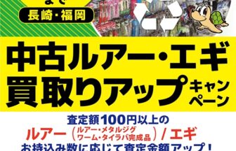 こんにちは、時津店さかもとです!本日より中古ルアー・エギ買取UPキャンペーンが始まりましたよ💯査定額100円以上の対象ル…