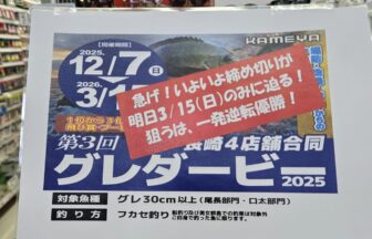 こんにちは、時津店スタッフ 橋本です。寒グレも終盤突入ですが、いよいよ長崎4店舗による第3回グレダービーも今日と明日のみ…