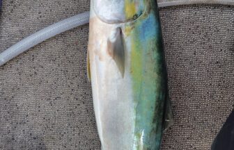 釣行の帰りにお持込み頂きました。全長97.5㎝、9.5kgのビッグな釣果です。ポッパーで表層を流しながら所々でダイブ気味に強く引く誘いでヒットに持ち込んだそうです。雨の中の釣行お疲れ様でしたm(__)mまたのお持込みをおまちしております。