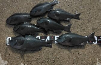 50m以上の遠投も交えて狙うと、31㎝~35㎝クロ5匹