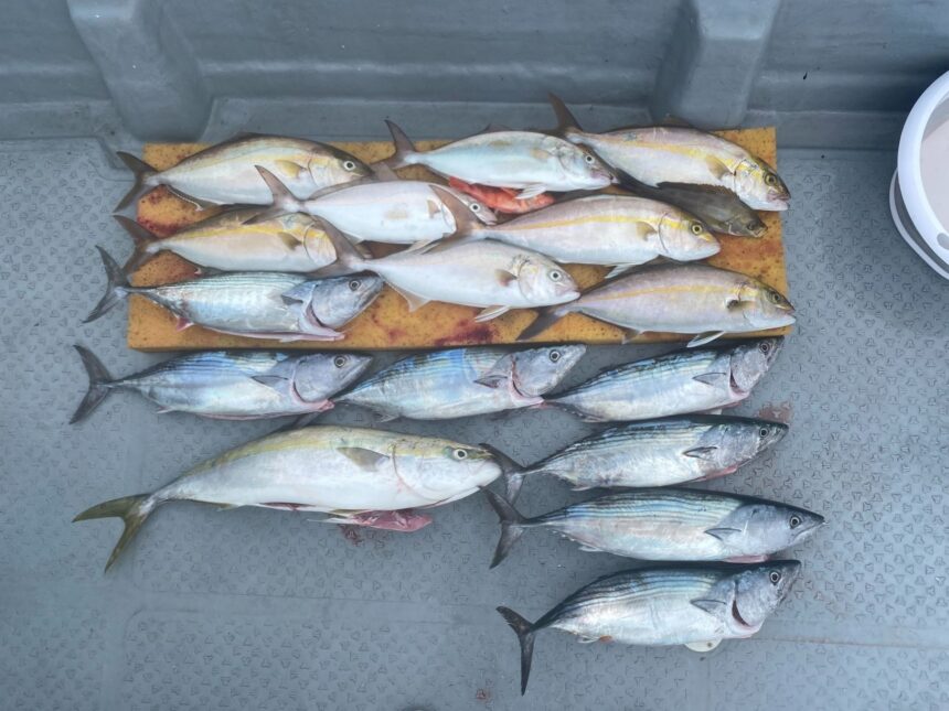 佐藤君は、初の落し込みでハガツオ、ネリゴを釣り上げご満悦、濱本様は落し込みとジグで次々にハガツオ、ネリゴ、ヤズ、自分はなぜか・・・