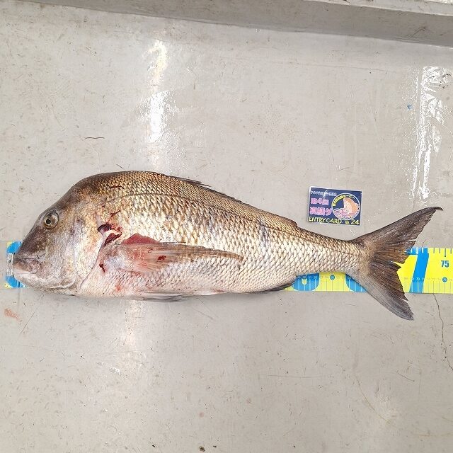 お持ち込み頂いたマダイは当店いて検量するので問題はございませんがメールにて写真登録の場合は、指定メジャー(KG-189)、エントリーカードの同時掲載が条件となります。