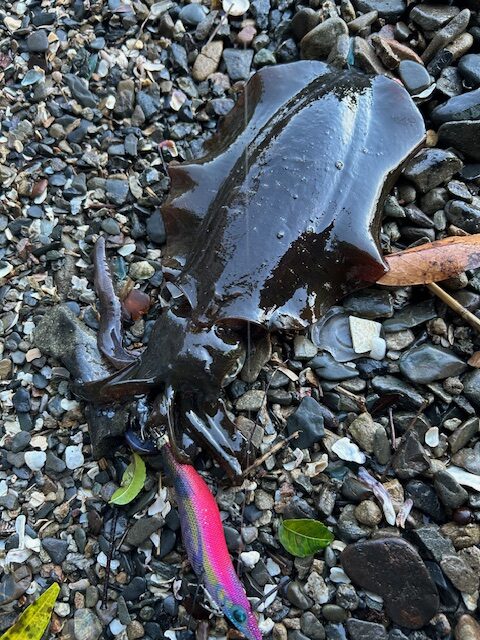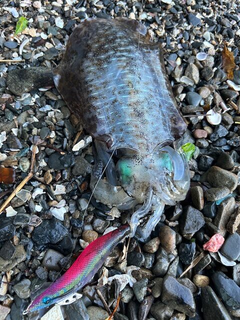 明るくなり始め、イカの活性がもう一段回上がっても釣れるサイズは変わらずで半ば良型は諦めていたものの、地磯帰りのゴロタ場にて言葉では形容し難い雰囲気を感じ、どシャローの藻場を慎重に攻めると全力でひったくるアタリッ!!!