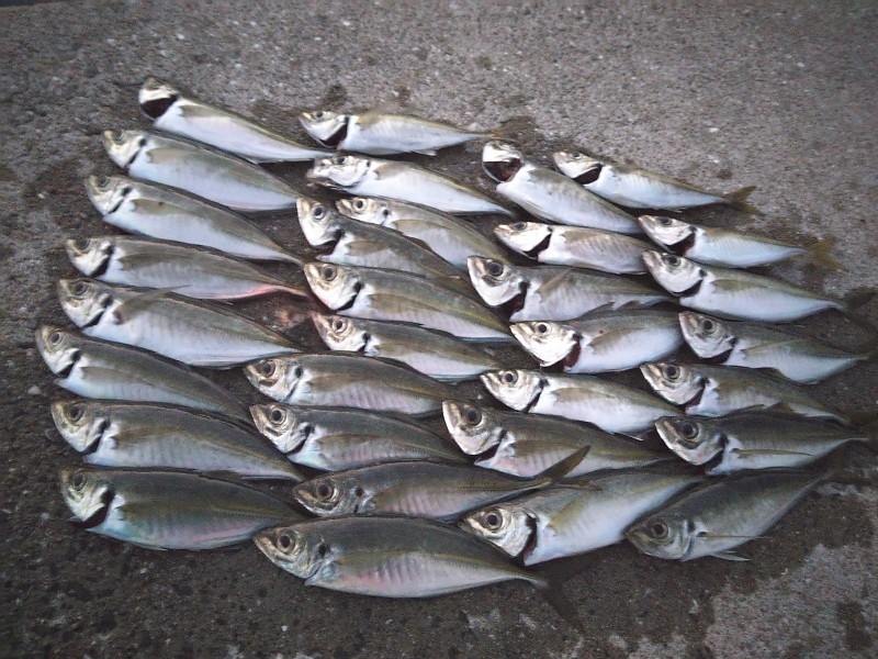 畝刈方面でのサビキ釣りで10~15cm程度のアジが釣れています。朝マズメのごく短時間でのみ群れが回ってくるとの事です。