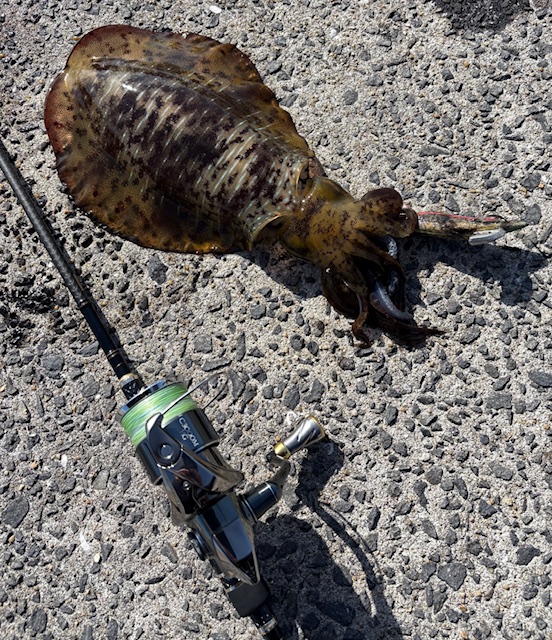 長崎南部のエギングにて600g程のアオリイカを頭に2杯釣れたそうです。