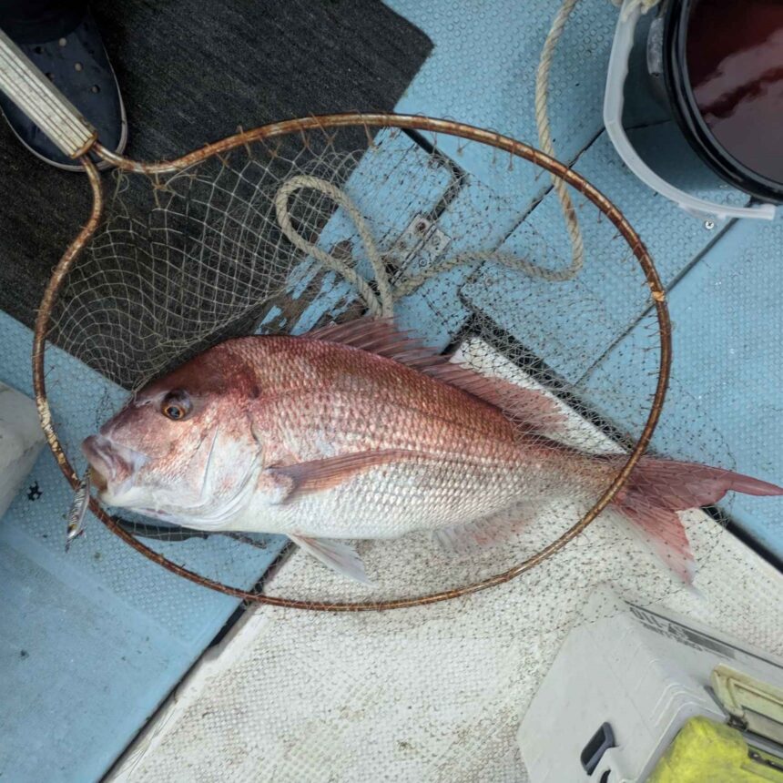 午前中の釣果で水深40m、漁礁を中心に探るそうです。カラーはレッド系で釣れたそうです。