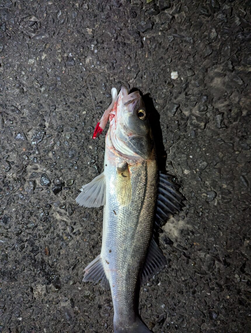 お客様からの釣果情報です。ワームを使用しスズキが釣れております。ボトム(底)を重点的に狙い釣られたそうです。同じサイズが2匹釣れたそうです。