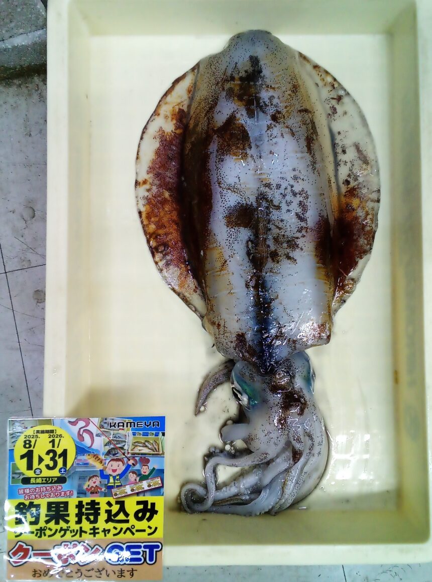 大瀬戸方面でのエギングで2145gのアオリイカが釣れたそうです。ケイムラのエギを使用し夜間の釣果です。