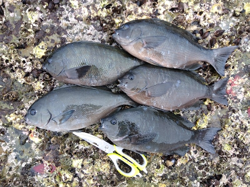 式見沖磯でのフカセ釣りで32cmまでのグレが4匹釣れたそうです。オキアミ生にパン粉、遠投系のマキエを混ぜタナは2ヒロ程度。エサ取り多く遠近を投げ分けて釣る必要があるそうです。