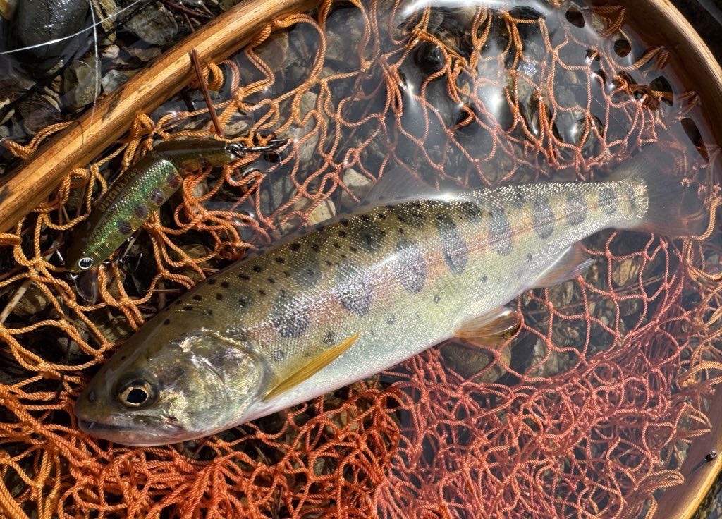 やっと、、、一匹捻り出すことが出来ましたが渋スギる…もう潔く河川を変えた方が良いと思い引き返そうとしたところでエエ感じの岩盤スリットを見つけました😻そこそこ水深があるので常用しがちなアレキサンドラFSではすぐ浮き上がると思い、新製品のメテオーラジョイントを投入してみました…!ダウン気味にスリットに流し入れるとひったくるようにバイト!良型ヤマメが釣れてくれました😼😼😼