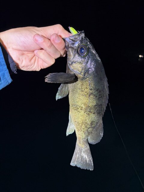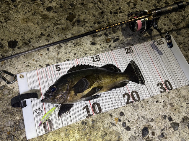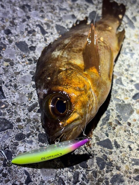 満潮に向かうにつれてメバルが浮いてきたので、防波堤の明暗部をカウントごとにスローリトリーブ。