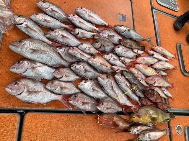伊王島沖でのタイラバでマダイほか白アマダイ・根魚などが好調です。オレンジ・グリーン系のネクタイに好反応です。