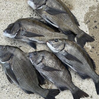 お客様より香焼方面にて午前中の短時間フカセで良型チヌ5匹の釣果です。餌取りが少なく、中層より下層でアタリが多かったそうです